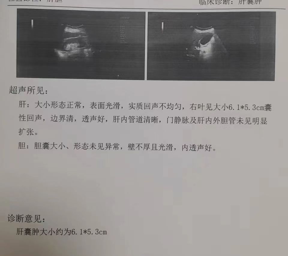 有段时间自己腰腹部偶尔会出现钝痛感,休息一下就好了,饭后时常感到有些恶心 但当时并没放在心里,以为是工作太累导致的。直到半年后的一天,我做给患者了一个长达3个多小时的手术,长时间的站立后腹部出现了更加明显的疼痛感。我赶紧给自己做了一个全面的检查。肝脏右页的囊肿长了将近3CM,变成6.1CMx5.3CM.